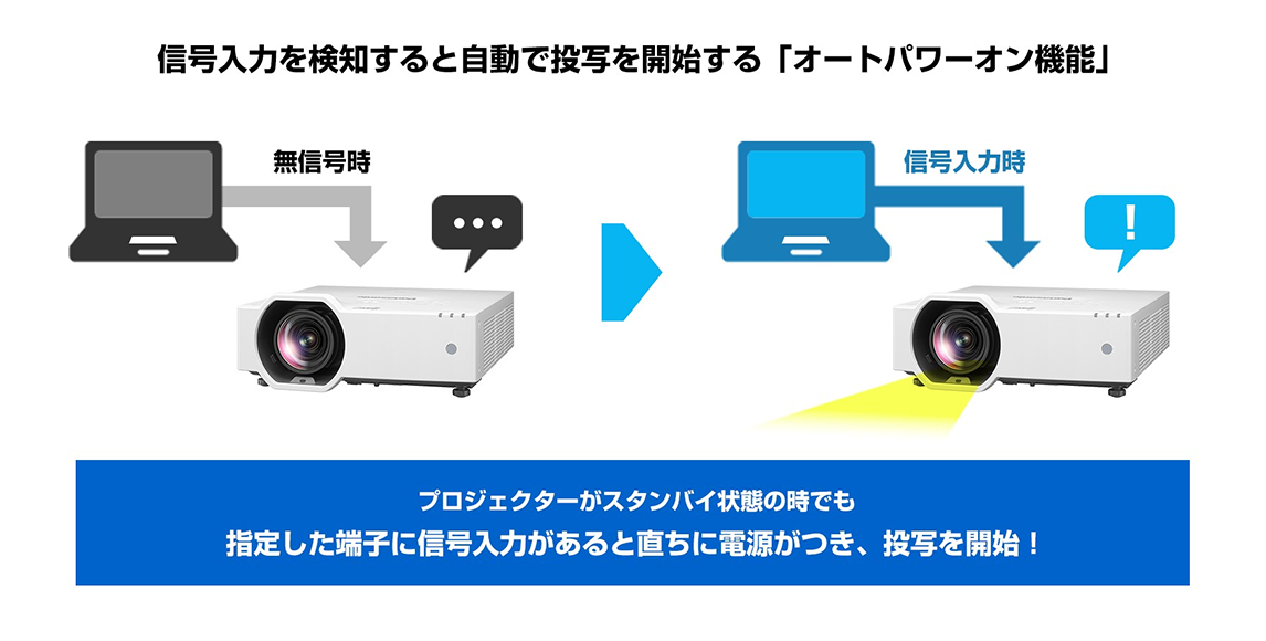 従来のパワーマネージメント機能の場合、一度「スタンバイ」状態に入ると手動で電源を入れ直す必要があり、会議中ずっと電源をオンにしておくなど待機電力の増大につながっていました。こうしたムダをなくすため、VMZ7STシリーズは「オートパワーオン機能」を搭載しています。「スタンバイ」状態に入った後でも、指定の端子に信号入力が検出されるとすぐさま電源がつき、投写を開始。電力消費を抑えつつ、スムーズなプレゼン再開をサポートします。
