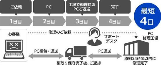 専用梱包箱を持って修理品の引取りにお伺いし、PC修理工場にて修理します。レッツノートが工場に到着後、原則24時間以内に修理を完了。運送日数を含め、約4営業日ですべてを完了いたします。