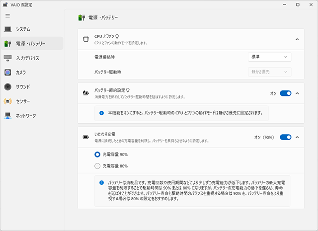 バッテリー交換なしでも長時間お使いいただけるVAIO独自の充電制御や、「いたわり充電モード」により、長期利用時にリチウムイオンバッテリーが劣化することで起こる実駆動時間の著しい低下やバッテリーパックの膨れを抑制します。