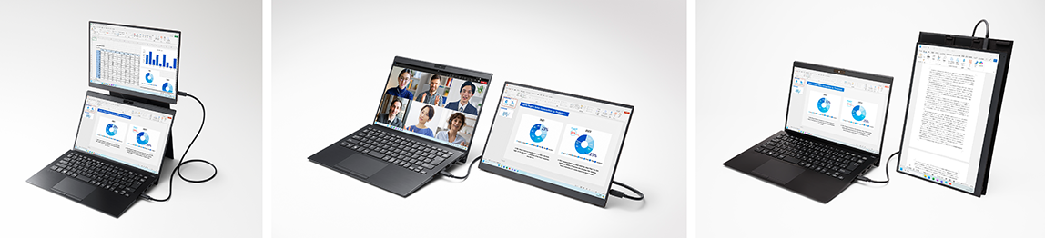 軽量かつ頑丈なモバイルディスプレイで、外出先でもオフィスワーク同等のデュアルモニター環境を実現。PC画面と合わせた二画面表示で快適に作業でき、訪問先にモニター環境がない場合でもスマートに資料を見せることができます。
