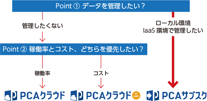 稼働率を重視する企業にはPCAクラウドを、コストを重視する企業にはPCAクラウド on AWSを、自社内でデータ管理を行いたい企業にはPCAサブスクといったように、顧客の要件に合わせて最適なサービスを提案しよう。