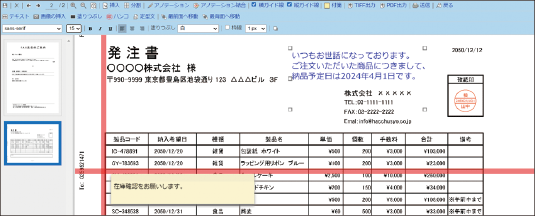 受信ファクスの「プレビュー」機能では、任意のテキストや画像を挿入できる。