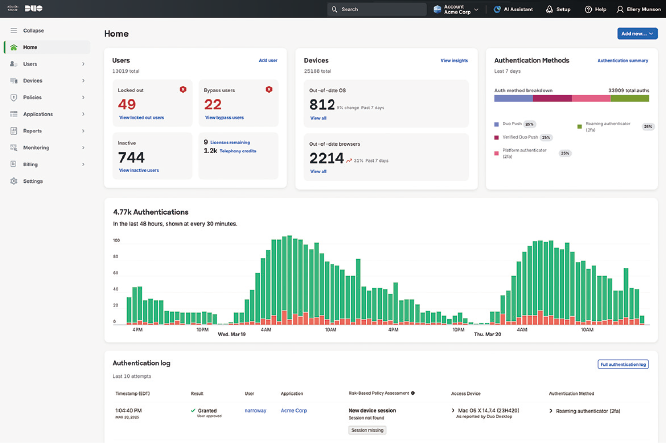ゼロトラストの実現には、ユーザーのIDを基点とした強固な認証基盤が不可欠だ。Cisco Duoは、MFAとシングルサインオンを組み合わせ、クラウドおよびオンプレミスアプリへの安全なアクセスを実現する認証基盤を提供する。ユーザーは専用ポータル「Duo Central」から業務アプリにアクセスでき、一度の認証で登録済みのサービスへシームレスにサインオン可能だ。ユーザーの利便性を維持しつつ、企業全体で統一された認証ポリシーを適用できる。