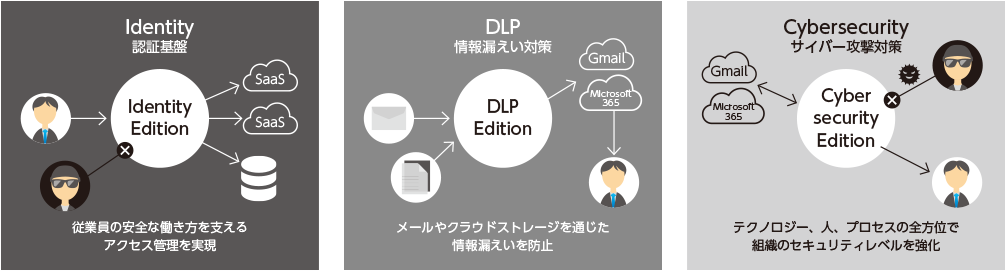 「HENNGE One」は、「Identity Edition」「DLP Edition」「Cybersecurity Edition」の三つの領域で構成される。順を追ってセキュリティの機能を見ていこう。Identity Editionは、さまざまなクラウドサービスに対し、シングルサインオン(SSO)や安全な多要素認証などによる認証基盤(IDaaS)を提供する。VPNを使用せずにオンプレミスシステムへのセキュアなリモートアクセスも実現できる。SSO、アクティブディレクトリ連携、ライフサイクル管理、多要素認証などにより、複数のシステムのIDを効率的に統合し、不正アクセス対策をサポートするEditionだ。SSOでは、SAML認証によって「Slack」や「Zoom」、「クラウドサイン」など443以上のクラウドサービスと連携可能だ。管理者向けWebマニュアルが完備されているため、スムーズなSSO設定を行える。万が一パスワードが盗まれても、プッシュ通知による本人確認や入場証といったデバイス認証など多要素認証を加えることで不正アクセス対策を可能としている。