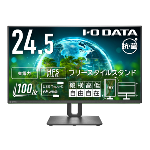 ワイド液晶ディスプレイ 24.5型/1920×1080/HDMI、USB Type-C/ブラック/スピーカー:なし/見やすい位置や高さに調節可能/「5年保証」/フリースタイルスタンド/抗菌