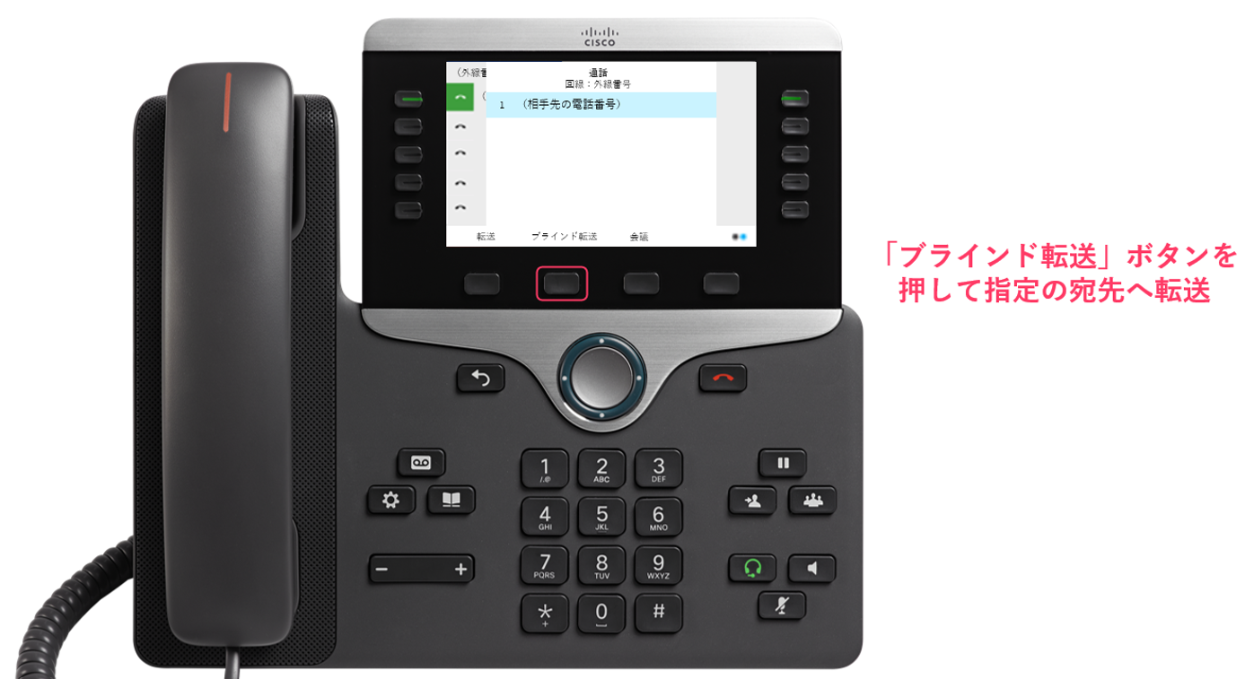 Cisco IP Phoneの場合は、「ブラインド転送」ボタンを押して転送することで担当者に直接転送されます。Webexアプリとは画面表示が異なりますのでご注意ください。