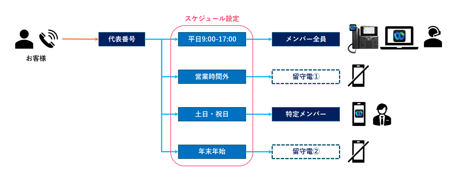 日本企業では一般的に、平日 9:00~17:00 を電話受付時間とし、それ以外の時間帯は「営業時間外アナウンス」を流す運用がよく見られます。Webex Calling でも同様に、あらかじめ“スケジュール”を作成し、そのスケジュールに基づいた着信ルーティング(ハントグループ・自動音声応答・着信転送など)を柔軟に行うことができます。