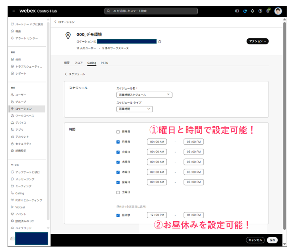 WebexCallingでは、スケジュール設定をGUIもしくはCSVにより設定が可能です。またスケジュールタイプを「営業時間」/「休日」の2タイプから選べるので、かなり柔軟なスケジュール設定ができます。