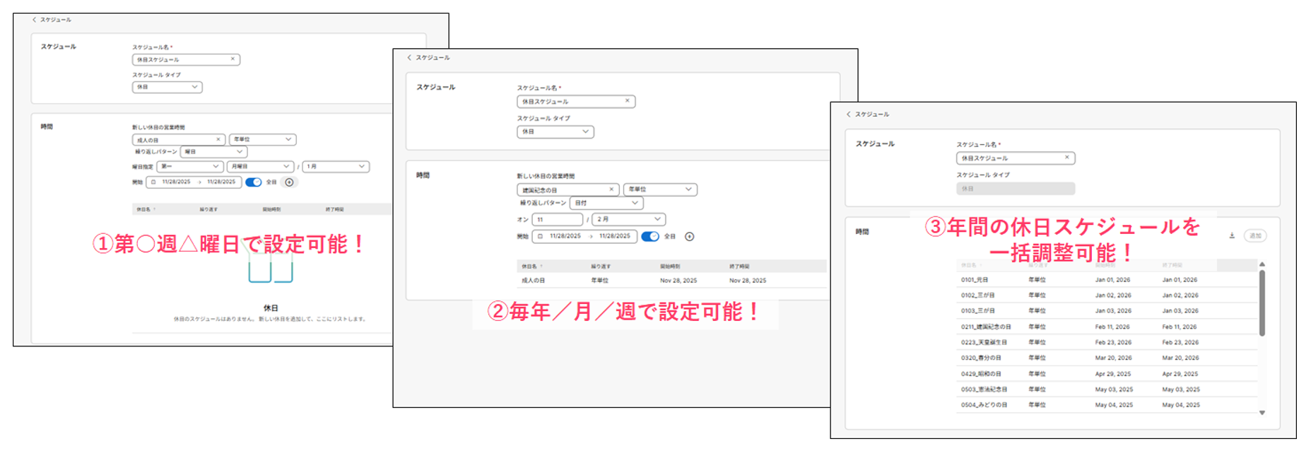 また「休日」タイプのスケジュール設定においても幅広く設定が可能です。