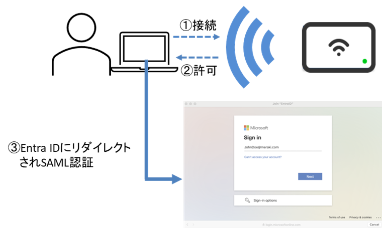この機能は、いわゆるWeb認証の要領で対象のSSIDへ接続するとブラウザが立ち上がりEntra IDにリダイレクトされてSAML認証画面にリダイレクトされる形になります。