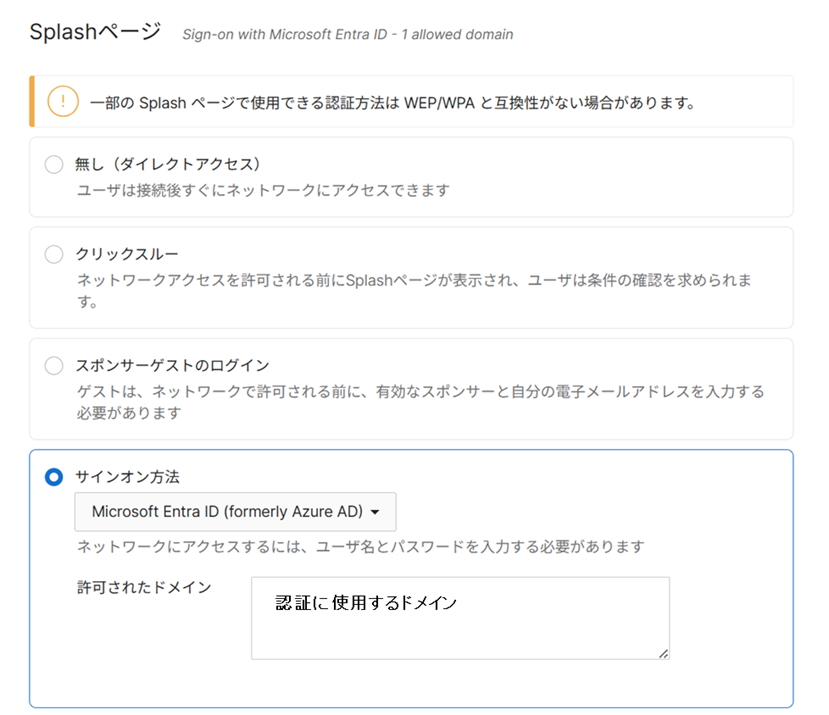 ワイヤレス > アクセス制御 の項目でアクセス制御からスプラッシュページの設定からサインオン方法でMicrosoft Entra IDを有効にします。