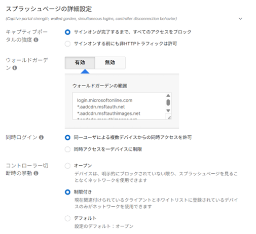 こちらを有効にした後にスプラッシュページの詳細設定の画面からEntra IDでの認証が完了する前の挙動を設定します。各項目の役割について簡単にまとめます。