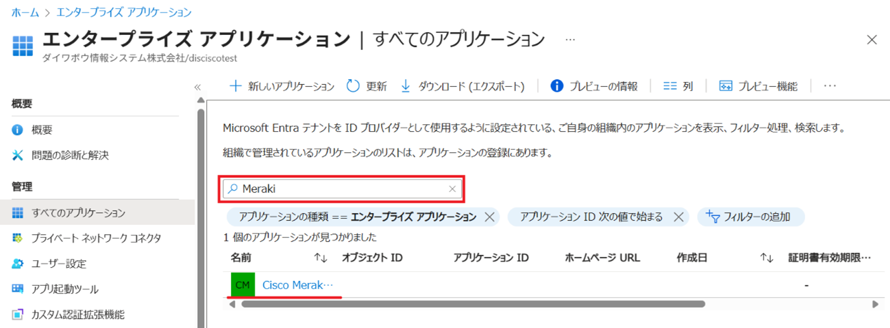 あとは、Entra ID側にMerakiからのリダイレクトを処理するためのエンタープライズアプリケーションを作成します。