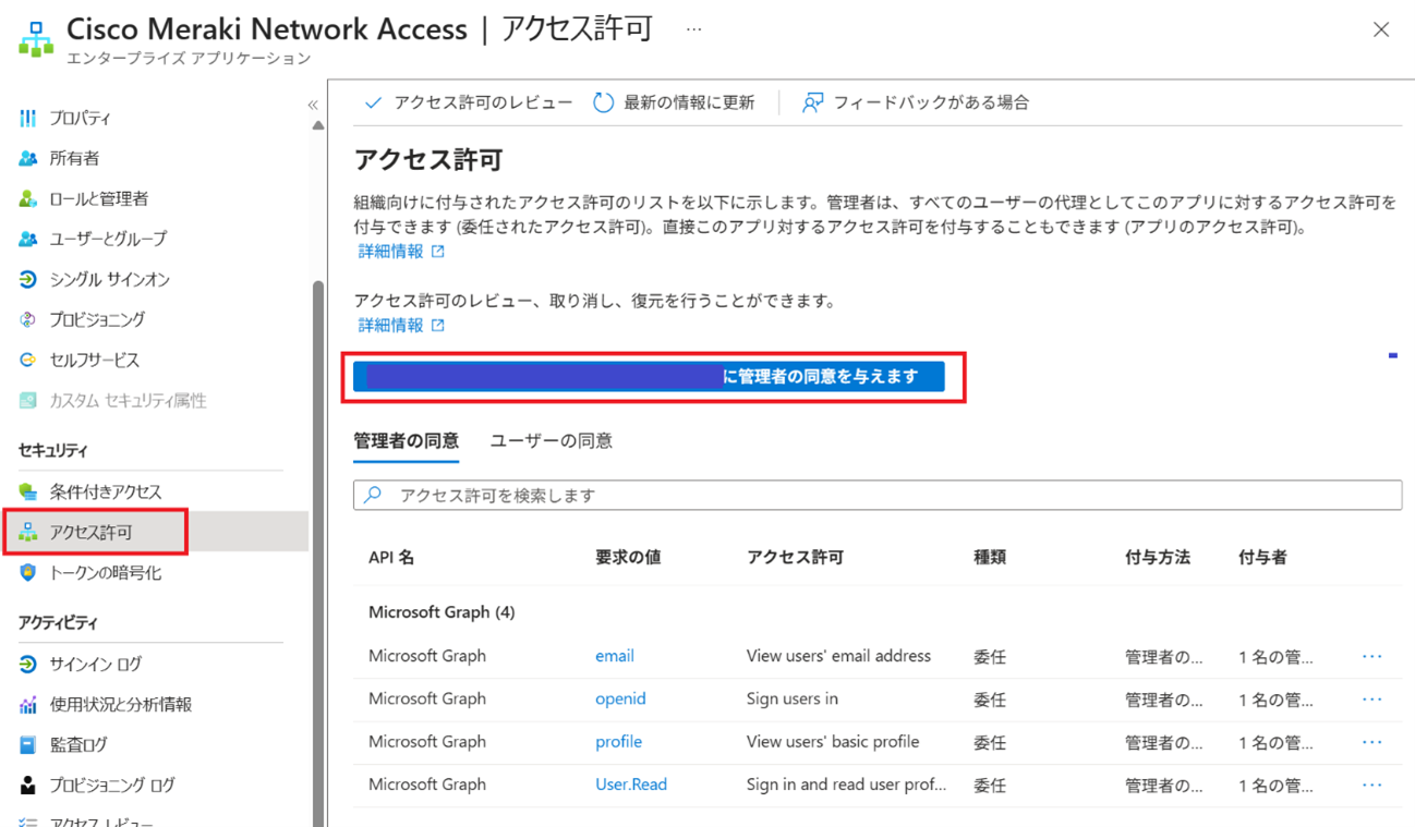 クリックするとEntraIDへのログインを求められるのでEntra IDの管理者IDでログインします。ログイン後自動的にエンタープライズアプリケーションとして「Cisco Meraki Network Access」が作成されますので、Entra管理センターで確認します。