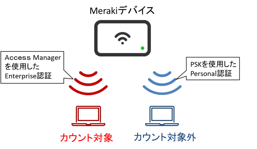 まずカウントの対象はAccess Managerの認証を経由してMerakiデバイスに接続したクライアントの台数です。PSKを使用するゲスト端末など、Access Managerで認証を行わないデバイスは対象外です。