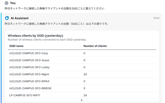 ちなみに既存でMerakiを使われている環境であれば、先日の記事で紹介したAIアシスタントにお願いしてみると、SSIDごとに1日あたりの接続クライアントを教えてくれたので、こういう情報を参考に使うとよさそうです。