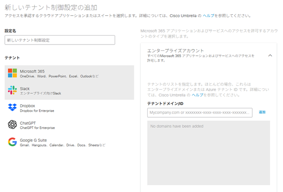 設定方法はシンプルで、アクセスを許可するテナントのドメインやIDを各サービス上で確認し、上記の画面で登録するだけです。