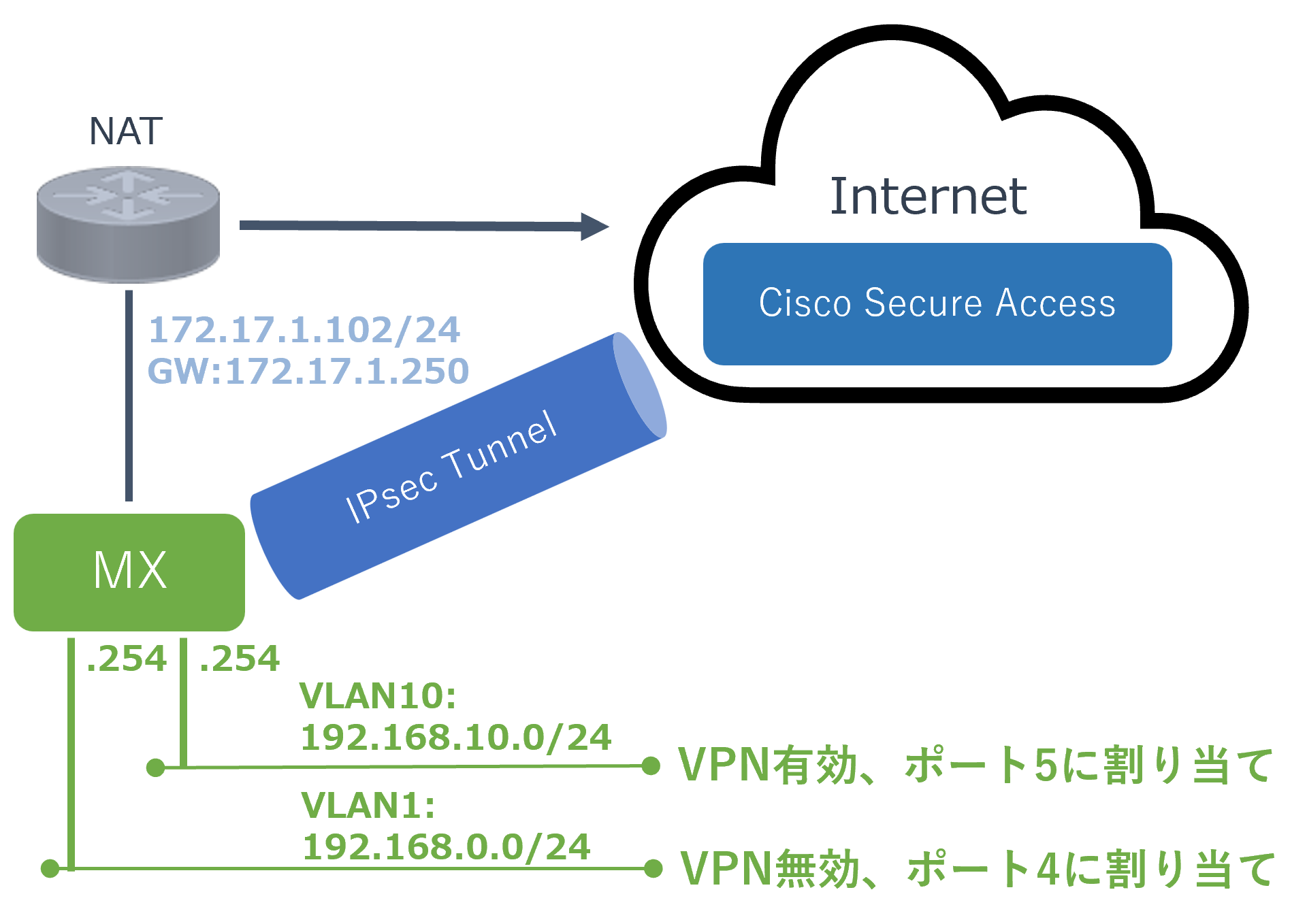 MerakiMXのポート4にVLAN1 192.168.0.0/24を割り当ててVPNを無効にし、ポート5にはVLAN10 192.168.10.0/24を割り当ててVPNを有効にします。