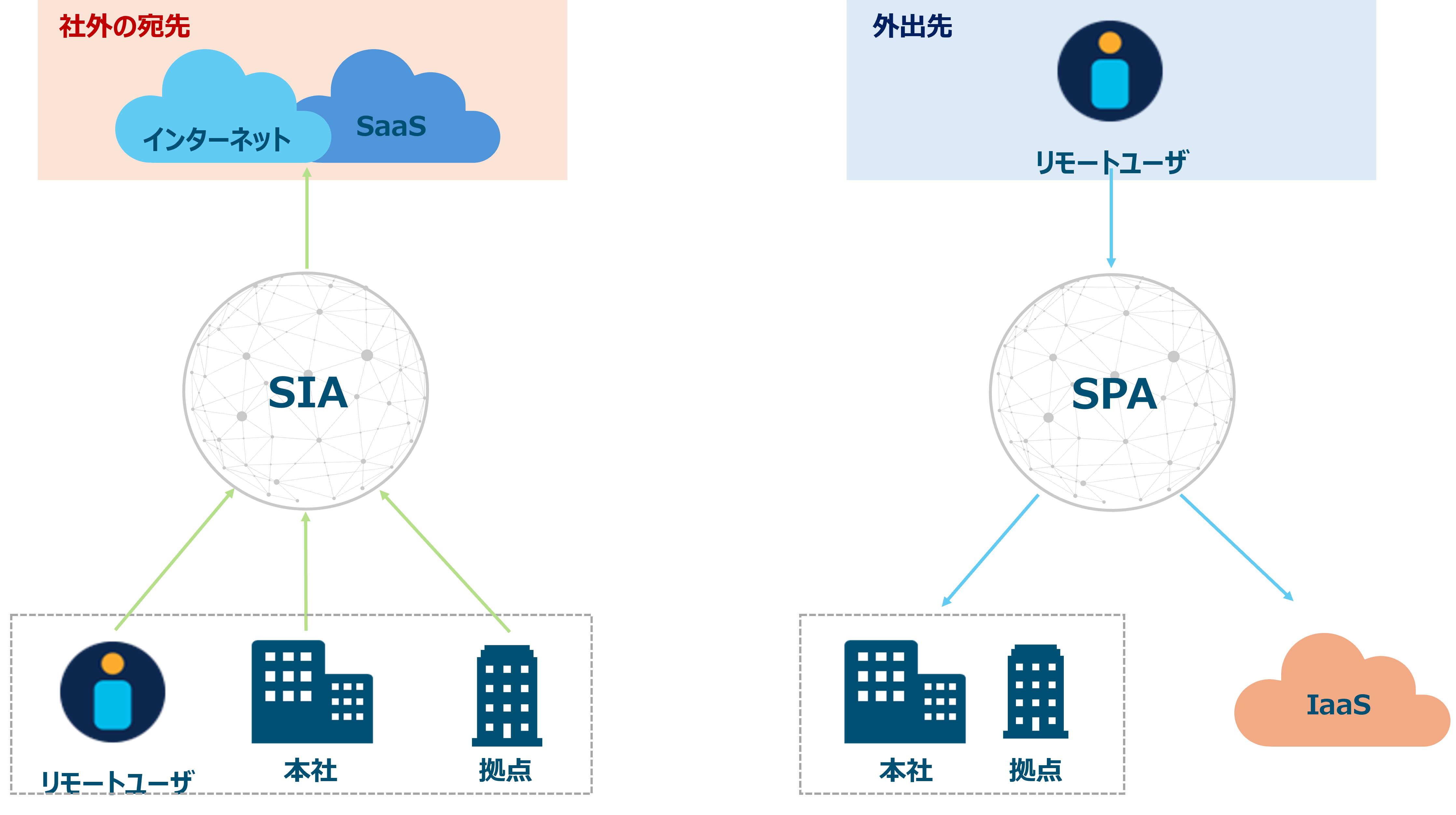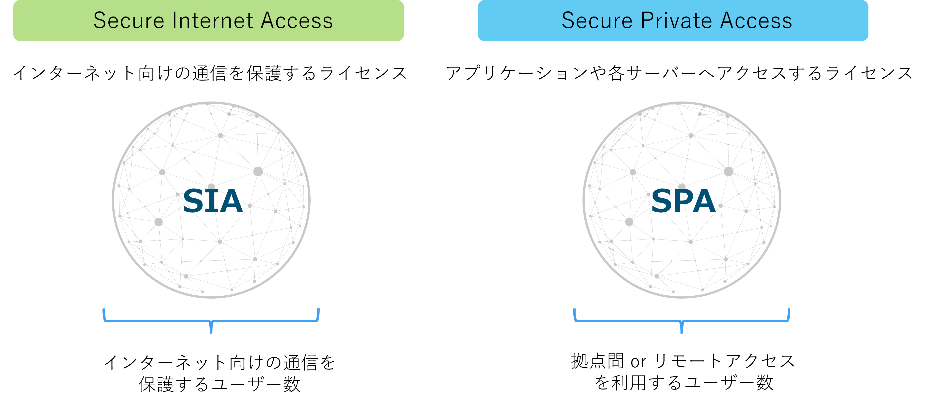 SIAはインターネット向けの通信を保護するライセンス、SPAはリモートユーザからアプリケーションやサーバーといった社内リソースへアクセスするライセンスです。SIAはインターネット向けの通信を保護するユーザー数、SPAは拠点間またはリモートアクセスを利用するユーザー数でカウントします。どちらも最小100ユーザーからご購入いただけます。