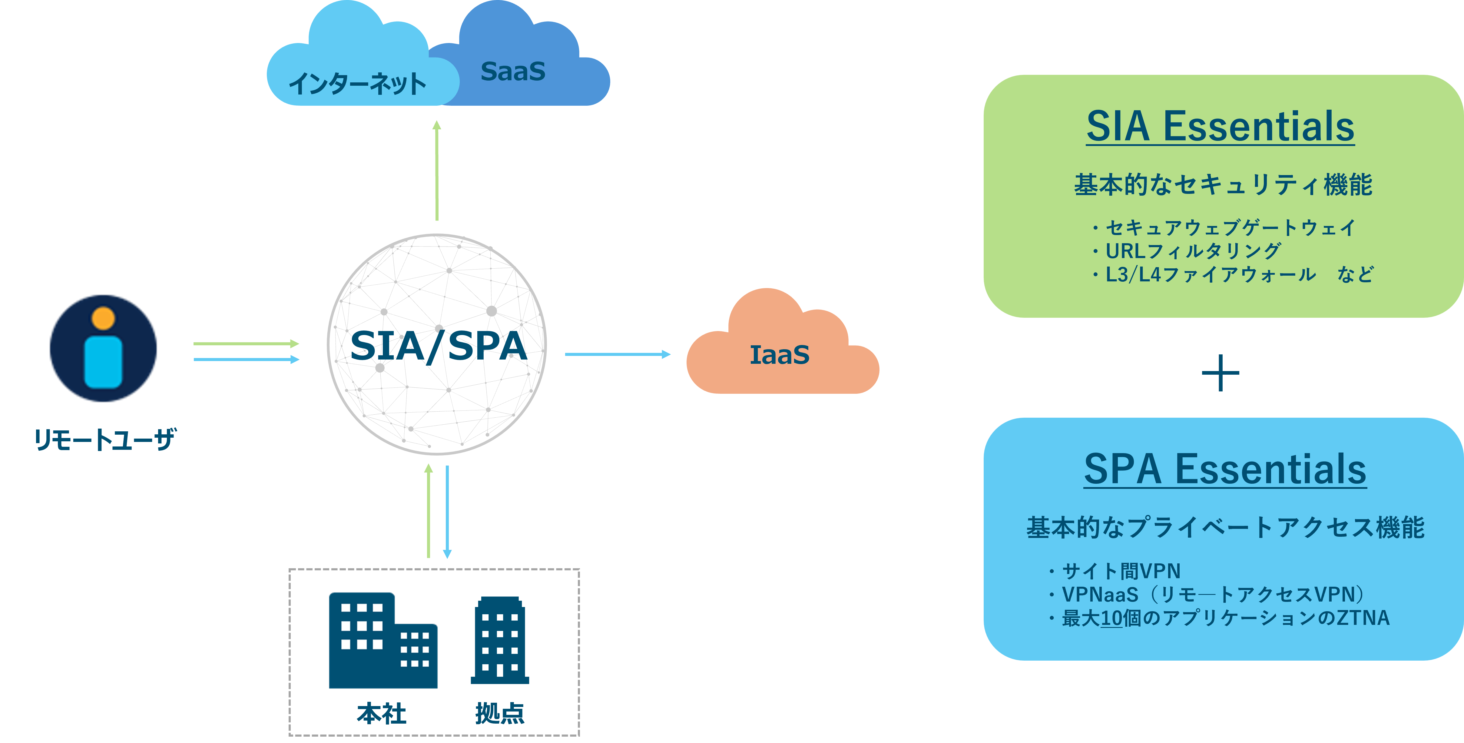低コストで、インターネット向けの通信とリモートユーザからの社内リソースへのアクセスの両方を保護したい場合は、「SIA Essentials + SPA Essentials」の構成がおすすめです。