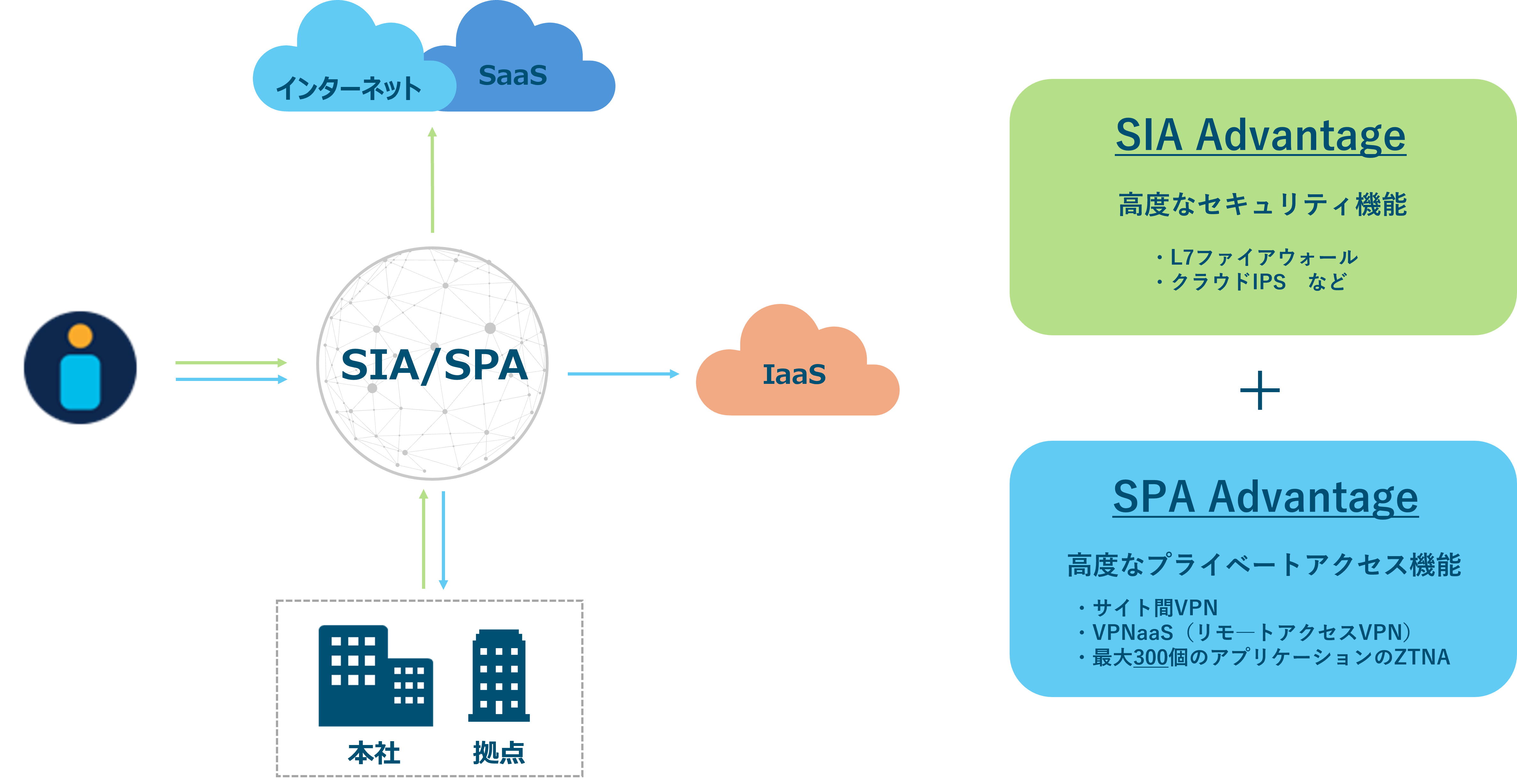 インターネット向けの通信と社内リソースへのアクセスの両方を高度なセキュリティで保護したい場合は、「SIA Advantage + SPA Advantage」の構成がおすすめです。