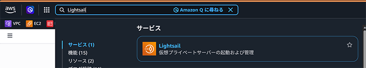 ・ログイン後にブラウザ上部にある検索ボックスに「Lightsail」と入力し、表示された「Lightsail」をクリックします。