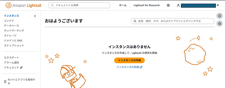 ※LightsailはEC2やRDSなどのサービスとは異なった独自のコンソール画面(下記の画像)が表示されます。