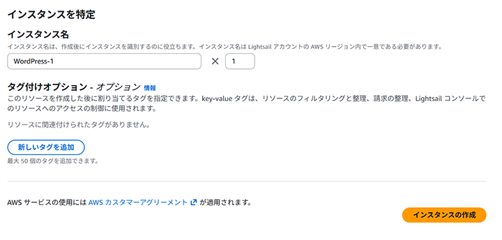 ※インスタンス名は自由に設定できますが、今回はデフォルトの値である「WordPress-1」で作成しました。