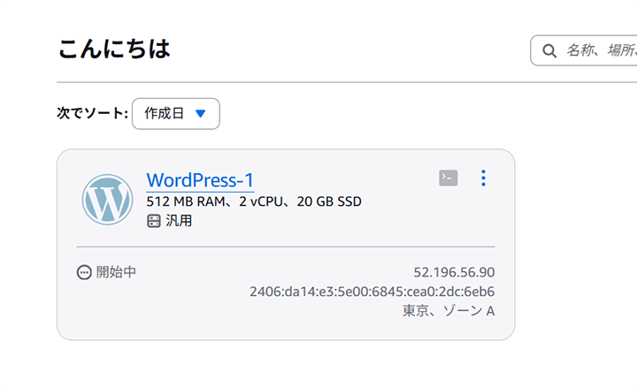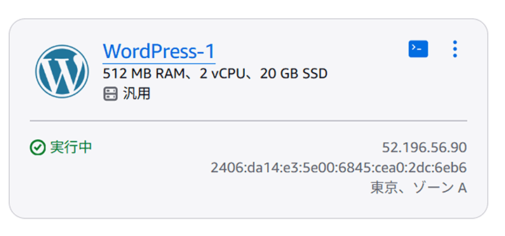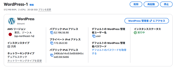 ※下記画像のインスタンス名「WordPress-1」をクリックすると、インスタンスの詳細情報が表示されます。