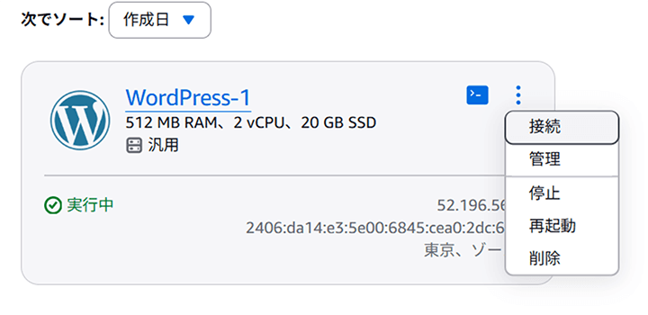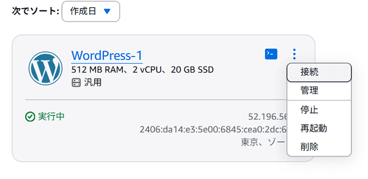 ・作成した「WordPress-1」の三点リーダー(縦)を選択し、接続をクリック