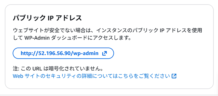 http://インスタンスのパブリックIPv4アドレス/wp-adminが表示されるため、自分でパブリックIPを修正せずとも、WordPressのログイン画面を表示できます。