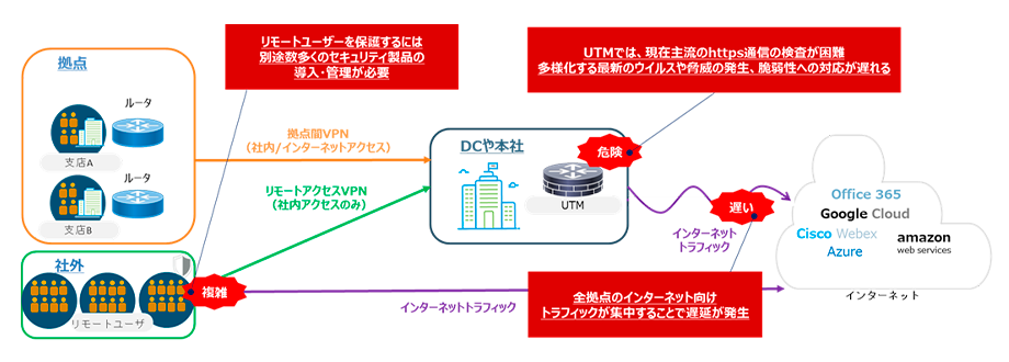 従来の企業ネットワークでは、データセンターなどの大規模拠点にUTMやファイアウォール、VPN装置などの機器を集中的に配置し、障害時に備えて冗長構成を組むというのが一般的でした。しかしこの方法では、すべてのインターネットアクセスが社内に集中するため、通信の遅延が発生しやすくなります。さらに、社外での業務やHTTPS通信においては、UTM(統合脅威管理)による保護が困難となり、ユーザーが脅威にさらされるリスクも高まります。加えて、近年ではランサムウェアや標的型攻撃などの巧妙化する攻撃への対応が求められており、セキュリティ製品を継続的にアップデートすることは、費用面・運用面で企業にとって大きな負担となっています。