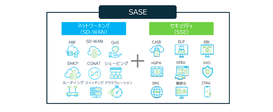 SASEはSecure Access Service Edgeの頭文字を取ったもので、WAN回線を効率的に利用する「SD-WAN」という機能と、ユーザーがどこにいても高度なセキュリティを実現する「SSE」という機能を統合した概念またはクラウドサービスを表す言葉です。