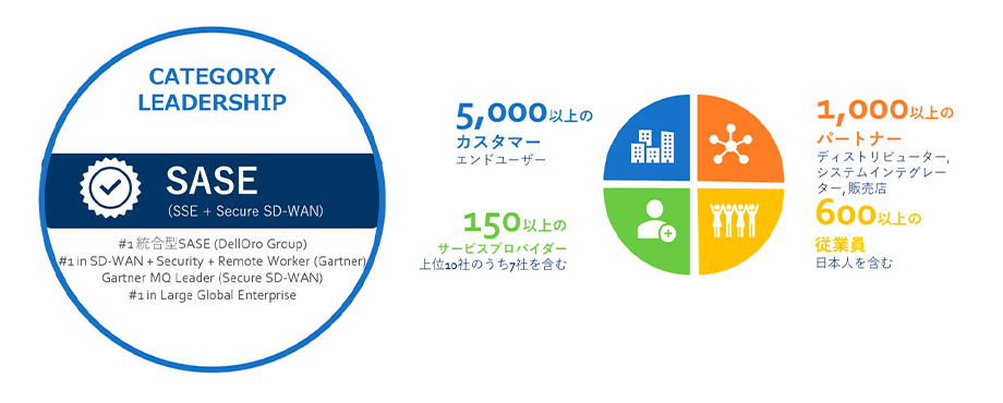 Versa Networksは、世界に先駆けてSD-WANやSASEの導入を進めているアメリカのベンダーで、SASEの概念が登場する以前から、SSEとSD-WANを統合したソリューションの開発を行ってきました。2022年にはアメリカのIT分野の調査会社であるガートナー社が出したレポートでSASE市場のリーダーとして選出されています。Versa Networksは、AdobeやSAMSUNGなどのグローバル企業にも採用されており、世界中で高い信頼を得ているベンダーの一つとなっています。