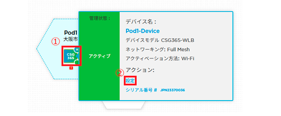 ① 設定対象のサイトにカーソルを合わせて、②「設定」を選択します。