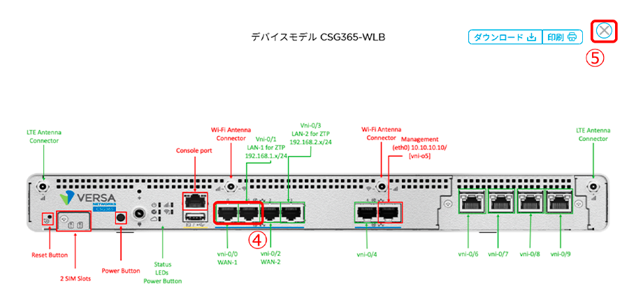 ④ 今回利用するWANインターフェース(ポート0、ポート1)の位置を確認し、⑤「×」を選択します。