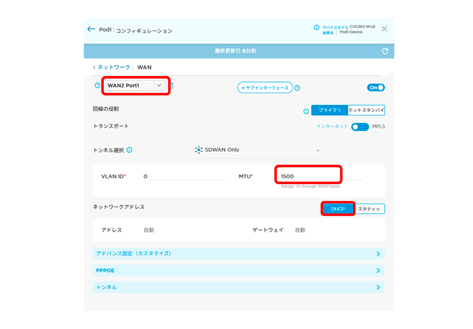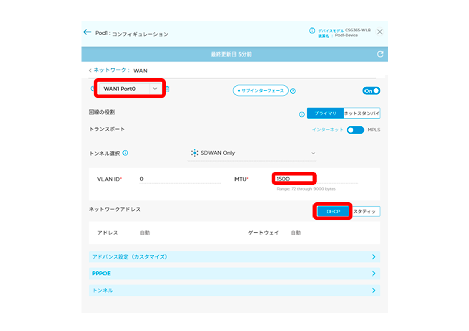 先ほど確認した1つ目のWANポート「WAN1 Port0」が表示されていることを確認します。MTUが「1500」に設定されている事を確認し、「DHCP」が選択されている事を確認します。