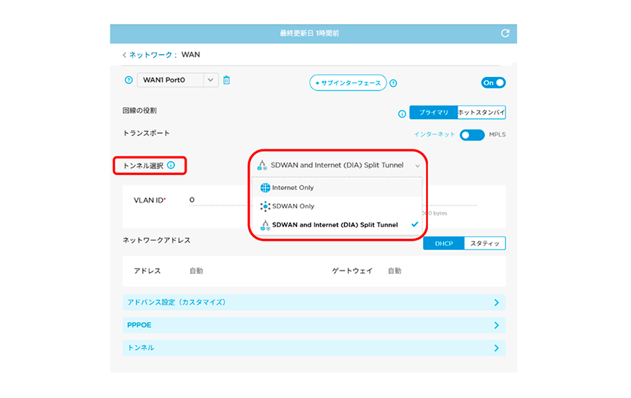 トンネル選択をクリックします。トンネル選択では「Internet Only」「SDWAN Only」「SDWAN and Internet(DIA) Split Tunnel」の3種類のトンネルが選択可能です。