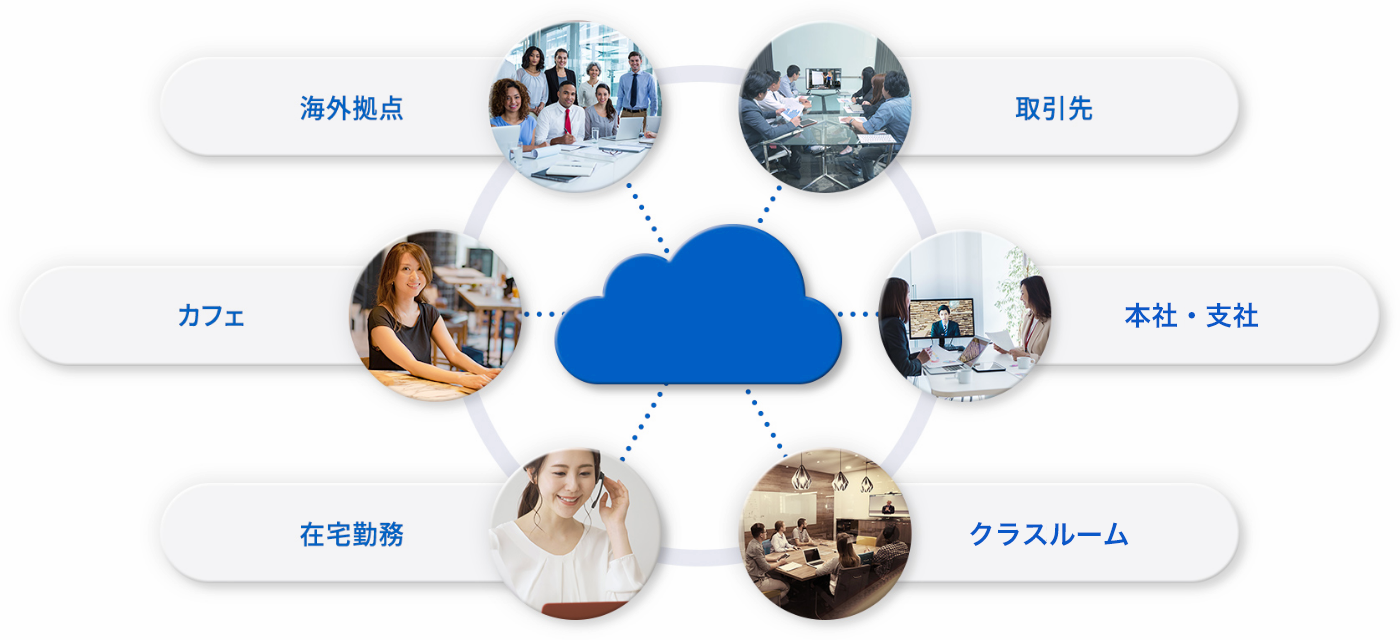 WEB会議・講義や授業を、いつでもどこでも開始できるデバイス・ライセンス・サービスで構成されるハイブリッドミーティングソリューションです。
